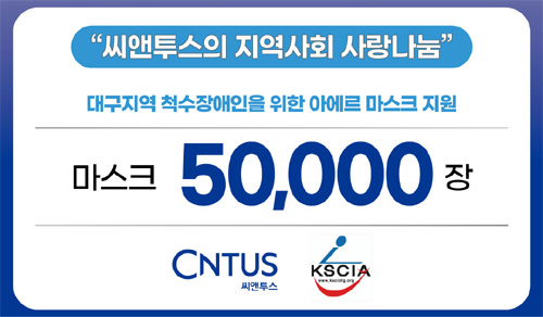 (사)한국척수장애인협회는 척수장애인들의 권익을 보호하고 대변함으로써 동등한 기회와 권리를 가진 사회 구성원으로 살아갈 수 있도록 지원하는 단체다. 씨앤투스가 기부한 마스크는 협회의 ‘2022 송년 감사의 날 with 척수장애인’ 행사를 통해 대구지역의 척수장애인과 소외계층에 전달될 예정이다. 씨앤투스는 작년에도 협회의 ‘코로나 극복기원 물품 지원 희망채움 프로젝트’에 마스크를 기부한 바 있다.