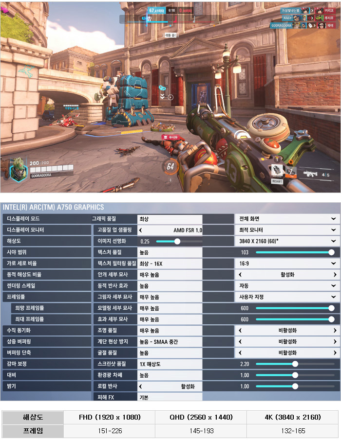 참고로 인텔 아크 그래픽은 일부 게임에서 해상도간 프레임차가 눈에 띄게 크지 않았다. 해상도별 성능차가 확연했던 배틀그라운드와 달리 오버워치2는 해상도를 변경해도 크게 성능이 저하되지 않는 것이 인상적이었다.