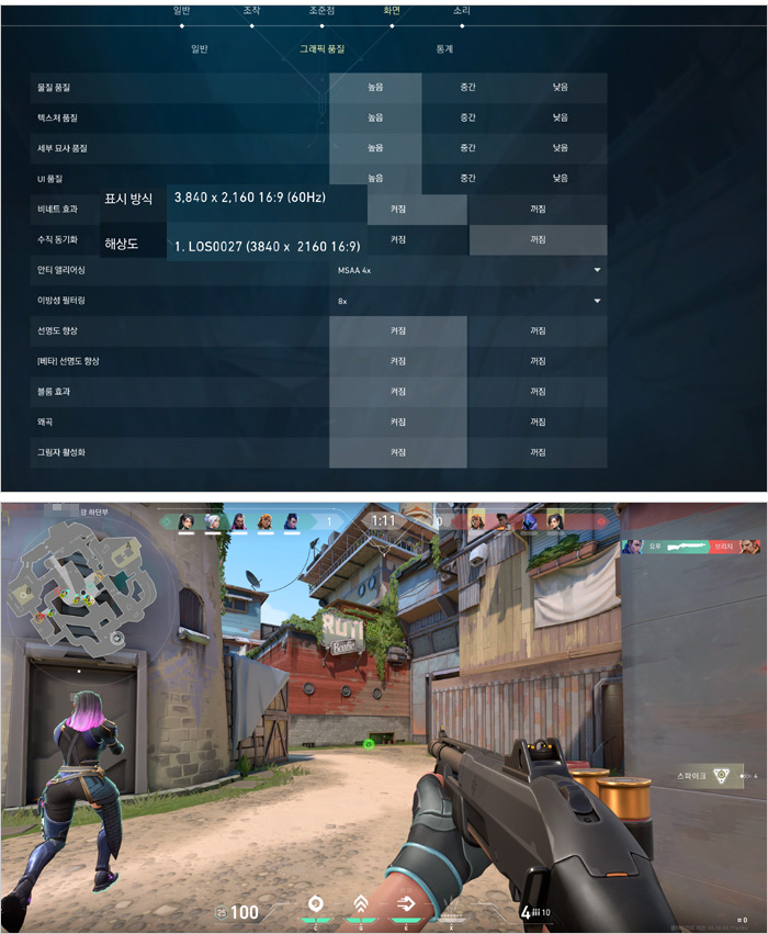마지막으로 최근 많은 유저들이 즐기고 있는 발로란트를 4K 해상도에서 플레이 하고 있는 모습으로 (해상도가 모니터에 고정되어 FHD나 QHD 는 테스트 하지 못했다.) 125-176 프레임을 보여주어 원할하게 게임을 플레이 할 수 있었다. 해상도에 관계없이 게이밍 모니터를 사용해 부드러운 게임 영상을 즐길 수 있을 것이다.