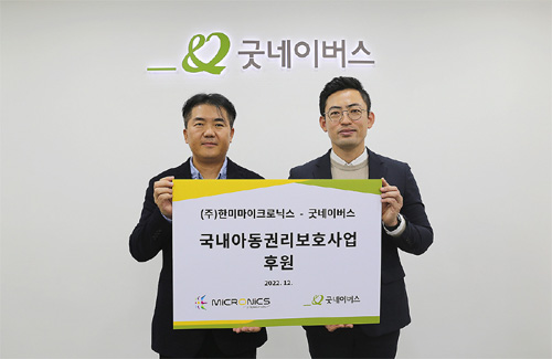 마이크로닉스는 지난 1일, 글로벌 아동권리 전문 비정부 기구(NGO) 굿네이버스의 ‘국내아동권리보호사업’을 위한 후원금 전달 및 사회공헌 협약식을 진행했다. 이번 협약을 통해 그간 진행해왔던 착한 소비 ‘굿바이(GOOD_BUY) 캠페인’도 계속 이어가게 되었다.