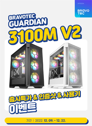 브라보텍에서 빅타워와 풀메쉬의 탁월한 확장성/쿨링 성능에 더욱 업그레이드된 고성능 140mm ARGB 팬 쿨러 4개와 USB 3.2 Gen 2 Type-C 포트를 탑재한 GUARDIAN 3100M V2 타이탄 글래스 모델을 출시한다.