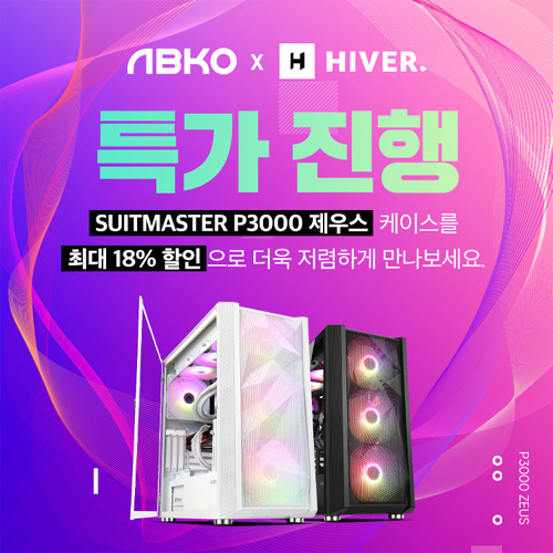 앱코 SUITMASTER의 P3000 케이스는 스마트쿨링 2.0 기술을 바탕으로, 온도에 따른 팬 속도 조절을 통해 정숙한 사용환경과 쾌적한 쿨링 환경을 모두 제공하는 앱코의 인기 케이스이다. 최근 출시되는 고성능 그래픽카드와 상단 3열 수랭 쿨러 · 대장급 공랭 쿨러까지 무난하게 장착이 가능해 최고급 게이밍 시스템을 구성하기에 적합하며, 4개의 팬에 적용된 ARGB를 통해 다른 부품과 어우러지는 RGB 셋팅도 가능하다. 또한, 양 측면을 여닫을 수 있도록 설계되어 조립성도 매우 뛰어나다.