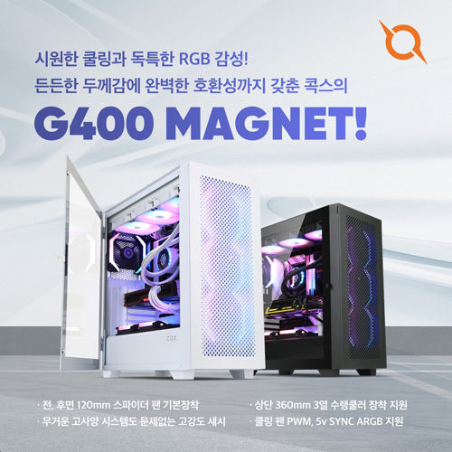 ‘G400 마그넷’ 케이스의 전면 원형 에어홀 패널은 베젤에 자석으로 연결되어 있어 세척과 관리가 매우 편리하고, 팬을 교체할 때도 베젤 분리 없이 패널만 제거한 채로 교체가 가능해 매우 편리하다. 원형 에어홀 디자인으로 제작된 만큼 공기 흐름도 뛰어나다. 상단 USB Type-C 지원으로 메인보드의 전면 C타입 헤더에 장착하게 되면 고성능 인터페이스 · 저장장치 등을 연결해 사용할 수 있으며, 여닫이 방식 강화유리를 장착하는 등 최신형 구성을 모두 갖추고 있다. 또한, 우측면에 120mm 쿨링 팬 2개를 장착할 수 있는 공간이 있으며 마그넷 먼지필터로 덮여 있어 손쉽게 관리할 수 있다.