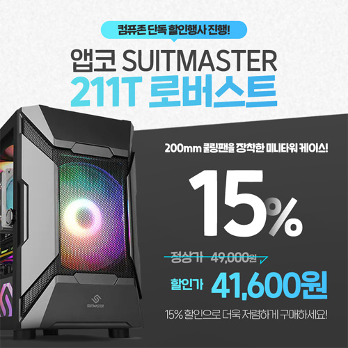 앱코의 프리미엄 케이스 브랜드 SUITMASTER의 ‘211T 로버스트’ 미니타워 케이스가 컴퓨존에서 단독 할인 판매 행사를 진행한다.
