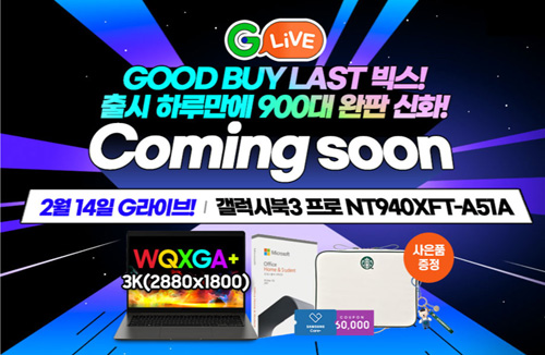 이번 G라이브 사전구매 라이브에서는 출시 후 각종 라이브방송과 사전구매 행사를 통해 완판 행진을 기록한 갤럭시북3 프로 14인치 NT940XFT-A51A모델을 출시기념 사전구매 특별 혜택과 라이브 방송 한정 할인 혜택을 적용하여 G라이브 행사 방송을 진행한다.