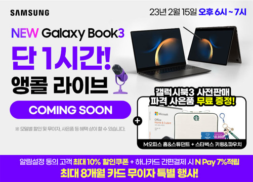 이번 블루밍데이즈 사전판매 라스트 특가 라이브에서는 삼성 갤럭시북2 프로 15.6형인 NT950XEE-X71A 모델과 갤럭시북2 NT750XEE-X71A모델 그리고 2023 새롭게 출시하여 큰 관심과 기대를 모으고 있는 갤럭시북3 대상 라이브 방송 특가 혜택과 알림 받기 쿠폰할인 10% 그리고 하나 카드 간편 결제 시 N포인트 추가 적립 및 최대 6개월 무이자 할부까지 함께 받을 수 있는 행사를 진행한다. 여기에 2023년 새롭게 출시한 13세대 갤럭시북3 모델 구매 시 MS Office와 스타벅스 파우치 & 키링 콜라보 사은품을 증정 받을 수 있으며, 해피 머니 상품권 증정 리뷰 이벤트까지 함께 진행된다고 한다.