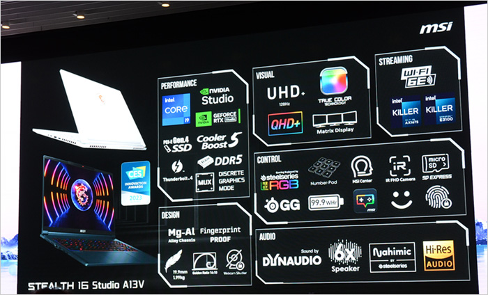 ‘The Leap to Singularity’(최고를 향한 도약)라는 슬로건을 내세운 이날 발표회에서는 ‘CES 2023’에서 혁신상을 수상한 ‘타이탄 GT77 HX’, ‘레이더 GE78 HX’, ‘스텔스 16/14 스튜디오’ 등 새로운 세대의 게이밍 노트북을 비롯하여 전문가용 초슬림 노트북 ‘크리에이터 Z 시리즈’, 1kg 미만(990g)의 초경량 비즈니스 노트북 ‘프레스티지 13 Evo’ 등 소비자의 니즈를 충족시켜 주는 다양한 제품을 발표했다.