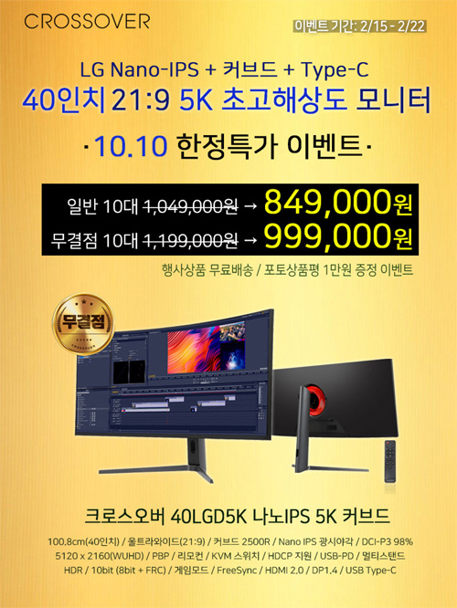 크로스오버가 40형 5K 초고해상도 커브드 모니터 ‘40LGD5K 나노IPS 5K 커브드’를 대상으로 10.10 초 한정 판매를 진행한다.