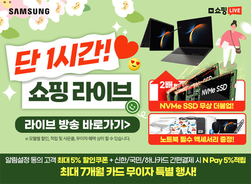 이번 갤럭시북3 스프링 페스타 봄맞이 특별 라이브에서는 2023 새롭게 출시하여 사전예약 기간 동안 완판 행진을 기록한 갤럭시북 3 모델들을 대상으로 진행되며, 라이브 방송 특가 혜택과 알림 받기 쿠폰할인 5% 그리고 신한/KB국민/하나 카드 간편 결제 시 N포인트 추가 적립 및 카드 무이자 할부 혜택까지 함께 받을 수 있다고 한다. 여기에 라이브 방송 중 갤럭시북3 모델 구매 시 NVMe SSD 512GB 추가 무료 증정과 블라썸 비즈니스 노트북 필수 3종 액세서리 패키지까지 함께 제공된다고 한다.