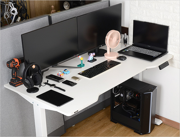 1400mm에서도 듀얼 모니터는 물론 다양한 액세서를 올려두고 책상을 사용할 수 있었다. (좁다는 느낌은 들지 않았다.) 단, 더 많은 주변기기나 사무용품을 올려두고 사용해야 할 경우 1600mm 제품을 구입하기 바란다.