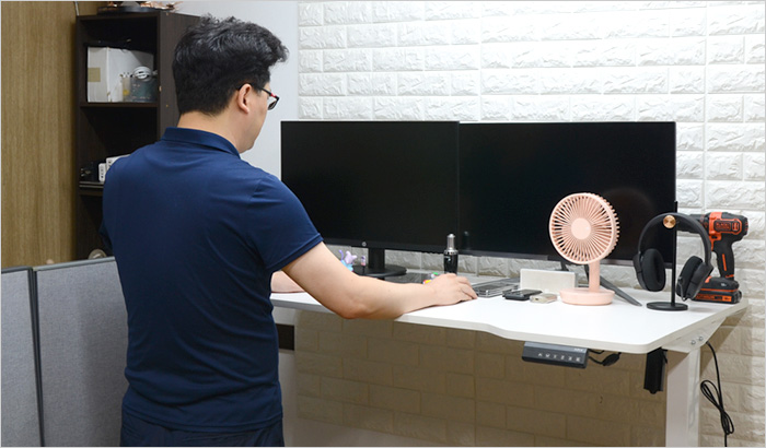 184cm 의 신장을 가진 필자가 직접 테스트를 진행하고 있는 모습으로 서서도 편하게 업무를 볼 수 있었다. 높낮이를 조절할 때 안정적으로 작동하는 것이 인상적이었으며 (진동은 전혀 발생하지 않았으며 소음도 전혀 신경쓸 수준이 아니다.) 최대 높이가 1220mm 으로 허리를 바로 세우고 PC를 사용할 수 있었다. @ 작동 방법은 동영상을 통해 확인하기 바란다.