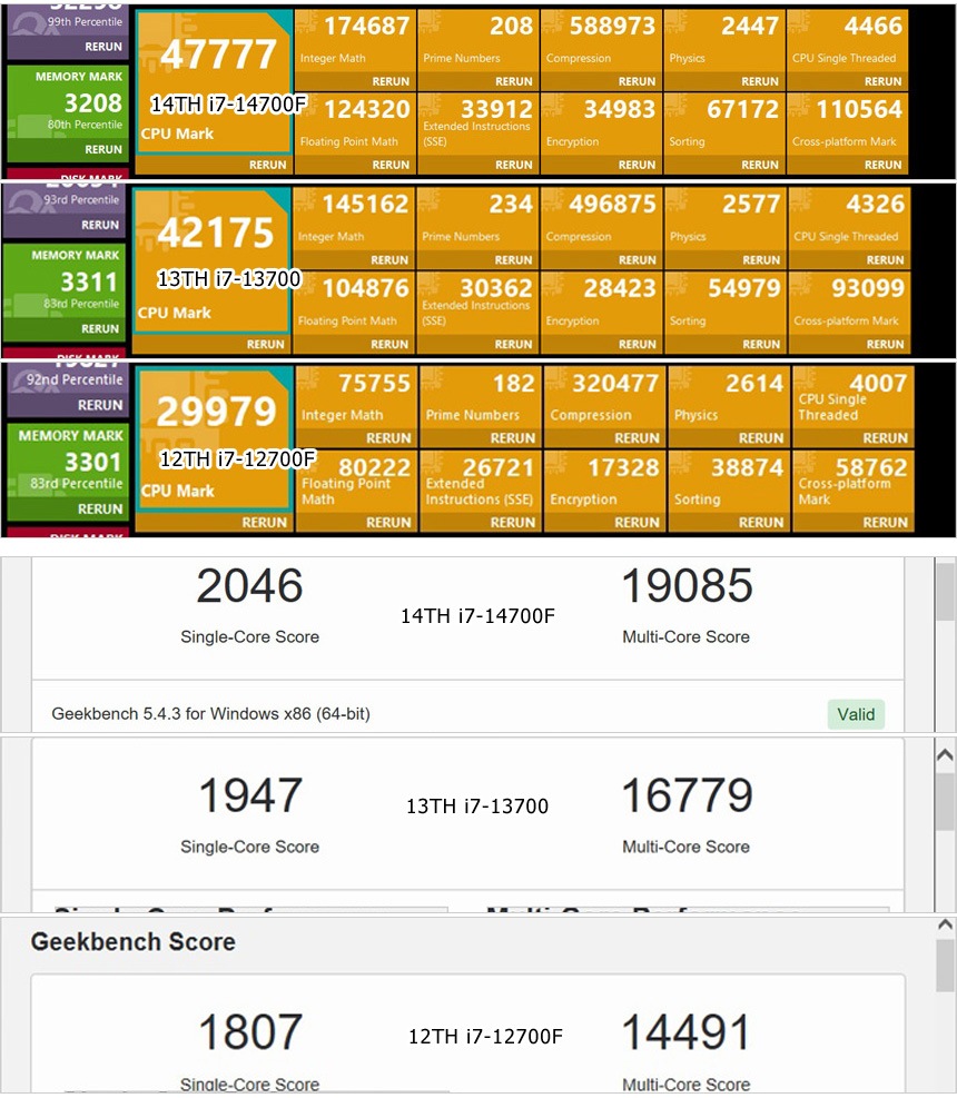 i7-14700F 는 코어와 캐시 용량이 늘어난 만큼 확실한 성능향상이 이루어져 12세대 이전의 PC를 사용하고 있던 유저들이라면 확연한 성능 향상을 경험할 수 있다. 특히 12세대 i5-12400 정도의 CPU를 사용했던 유저들이라면 CPU 교체만으로 확연한 성능 향상을 이룰 수 있다. 이런 이유로 12세대 시스템을 사용하는 유저들에게 특히 추천한다.