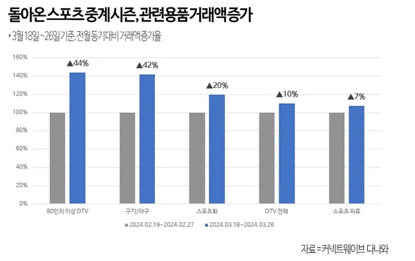 한편 본격적으로 스포츠 중계 시즌에 진입하며 TV외에도 관련용품의 거래액도 증가하고 있다. 다나와 자료에 따르면 3월 18일부터 26일까지 거래된 구기/야구 카테고리의 거래액이 전월 동기 대비 42% 증가했으며 스포츠 신발이 20%, 스포츠 의류가 7% 증가했다.?