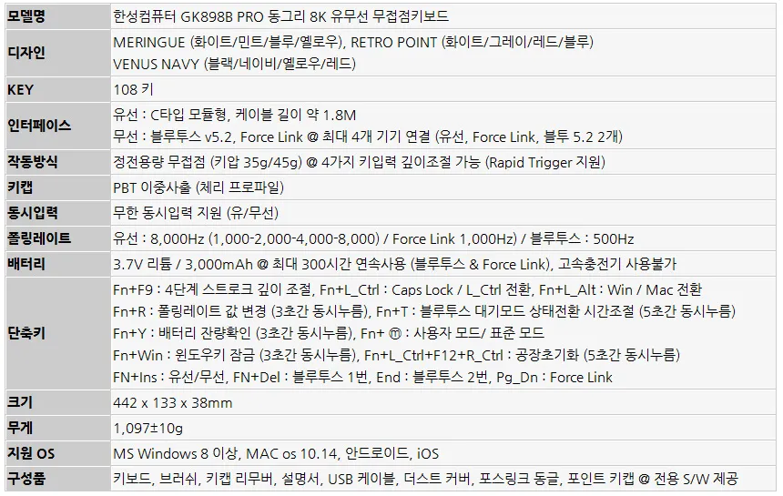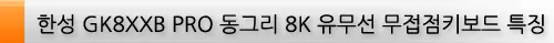 테스트용 제품인 한성컴퓨터 GK898B PRO 동그리 8K 유무선 무접점키보드의 모습으로 442 x 133 x 38mm의 크기와 약 1,097g 의 무게를 지원한다. 공간활용성이 휴대성을 고려한 다른 시리즈와 달리 집이나 사무실 등에 설치해 놓고 사용하기에 적합한 제품으로 크기가 상당한 것을 확인할 수 있다. 특히 대용량 배터리 까지 내장되어 무게도 1Kg을 넘는다. (무거운 것은 단점이 아니다. 과격한 타이핑에서도 흔들림이 없기 때문이다.)