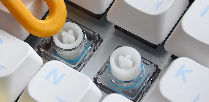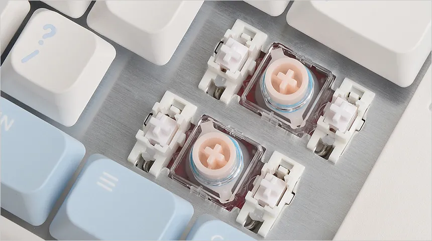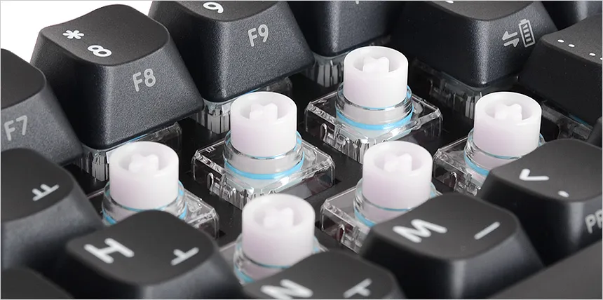 특히 키캡 채결시 안정성을 높이기 위해 십자스템을 사용해 미세한 흔들림 등이 발생해 타이핑에 방해를 주는 일부 제품과 달리 안정적으로 타이핑 할 수 있으며 35g 와 45g의 낮은 키압을 지원해 손가락에 힘을 주지 않고도 자연스럽게 타이핑 할 수 있다.
