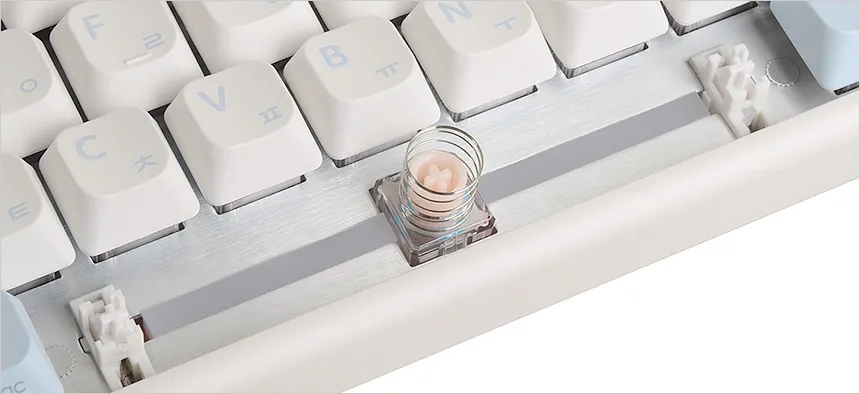 스페이스바와 쉬프트 키의 모습으로 키의 힘을 분배하는 체리식 스테빌라이저가 설치되어 중앙이 아닌 모서리 부분을 눌러도 자연스런 타이핑이 가능하다. 특히 스페이스바 중앙 키스위치에는 스프링이 추가로 적용되어 높은 반발력을 구현한다. 참고로 통울림을 최소화 하면서 내구성을 높이기 위해 스페이스바에 러버가이드가 부착되어 있고 특유의 마찰음을 최소화 하기 위해 윤활처리도 되어 있다. 저가형 제품에서 흔히 들리는 속빈 소리가 들리지 않고 작지만 무거운 키사운드를 들려 주는 모델이다.