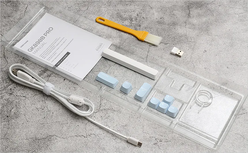 이번에 출시된 제품들은 리뷰용 모델인 GK898B PRO 동그리 8K와 텐키리스 모델인 GK893B PRO 동그리 8K, 휴대성에 특화된 GK893B PRO 동그리 8K로 프리미엄 시리즈 답게 키보드는 물론 브러쉬, 키캡 리무버, 설명서, USB 케이블, 더스트 커버, 포스링크 동글, 포인트 키캡 등 다양한 액세서리를 기본 제공한다.