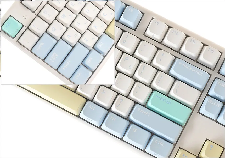 키캡 리무버를 기본 제공해 손쉽게 키캡을 분리할 수 있다. OEM 키캡대비 높이가 낮아 손목 부담을 출인 체리 프로파일 키캡을 적용했으며 염료승화 방식에 버금가는 높은 완성도를 보여주는 이중사출 방식을 적용했다. 또한 높은 제작비용으로 고급형 키보드에서 주로 사용되는 PBT 키캡을 사용했다. 부드러운 표면 촉감은 물론 높은 내구성을 구현하며 ABS 재질 대비 수분흡수도와 마모도가 낮아 오랜시간 쾌적한 타이핑이 가능하다. @ 사진에서 볼수 있듯 키캡의 마감 상태가 대단히 양호한 것을 확인할 수 있다. (프리미엄 키보드 다운 모습이라 말씀드리고 싶다.)