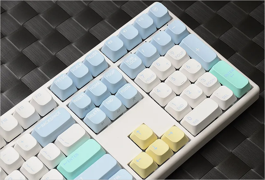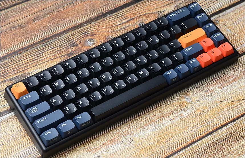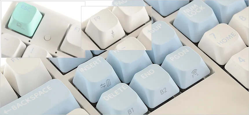 양 측면에 설치된 평션키의 모습으로 쉬프트 사용이 많은 국내 환경을 고려해 롱타입이 적용했으며 자주 사용되는 엔터나 스페이스바, 쉬프트 키에 컬러 키캡을 적용해 주목성을 높였다. 또한 NUM 키패드가 설치되어 있으며 상단에는 상태표시 LED (블루투스 대기모드 상태전환과 배터리 잔량, 폴링레이트 확인 가능) 와 볼륨조절 키가 제공되는 것을 확인할 수 있다.