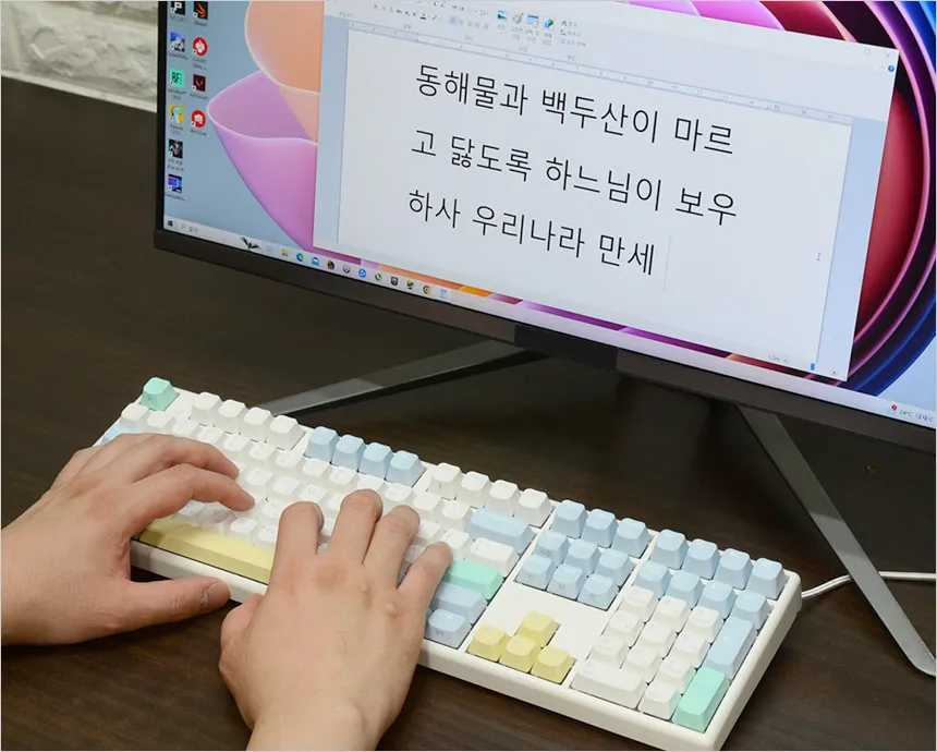 타이핑 테스트를 진행하고 있는 모습으로 일반적인 접점 방식의 키보드와 달리 눌림이 일정수치를 넘었을 때 작동하는 정전용량 무접접 방식의 특성상 기계식 대비 확연한 타건음이나 피드백을 느낄 수는 없었지만 자연스러운 키의 눌림으로 편하게 타이핑 할 수 있는점은 아주 매력적이었다. (10년 이상 체리 청축과 갈축만 사용하고 있어 특히 적응에 시간이 필요했다.)