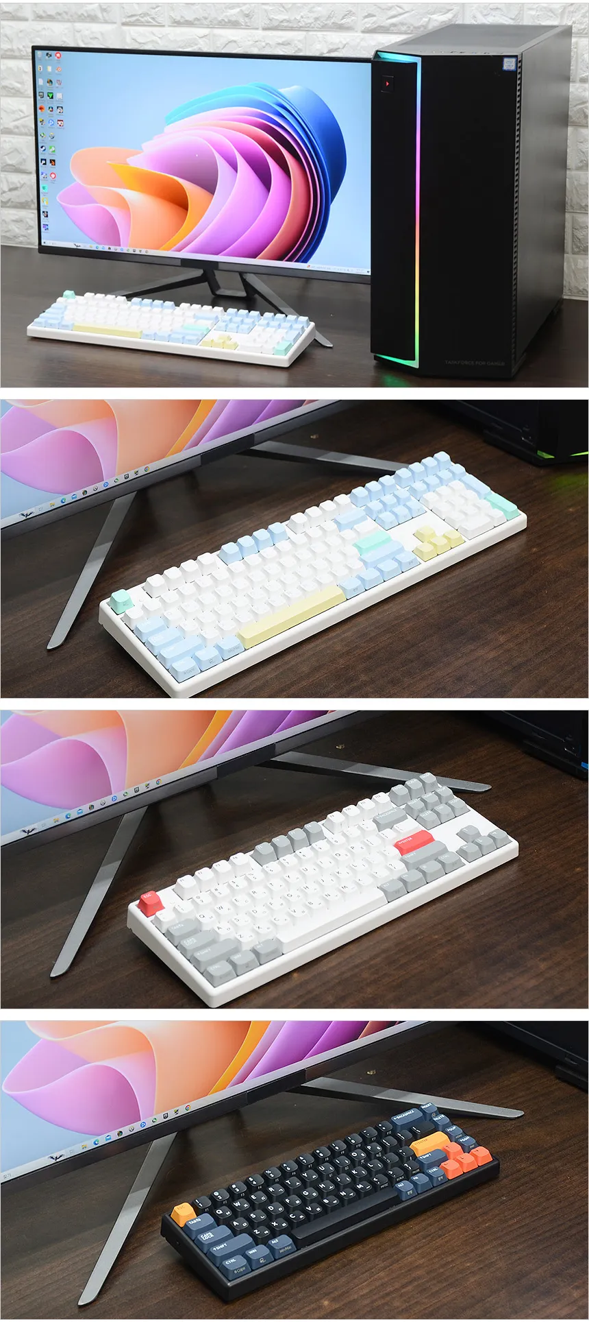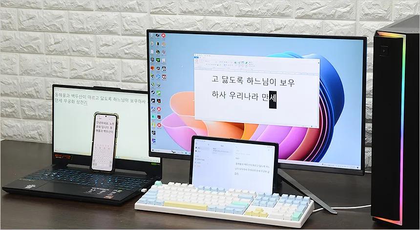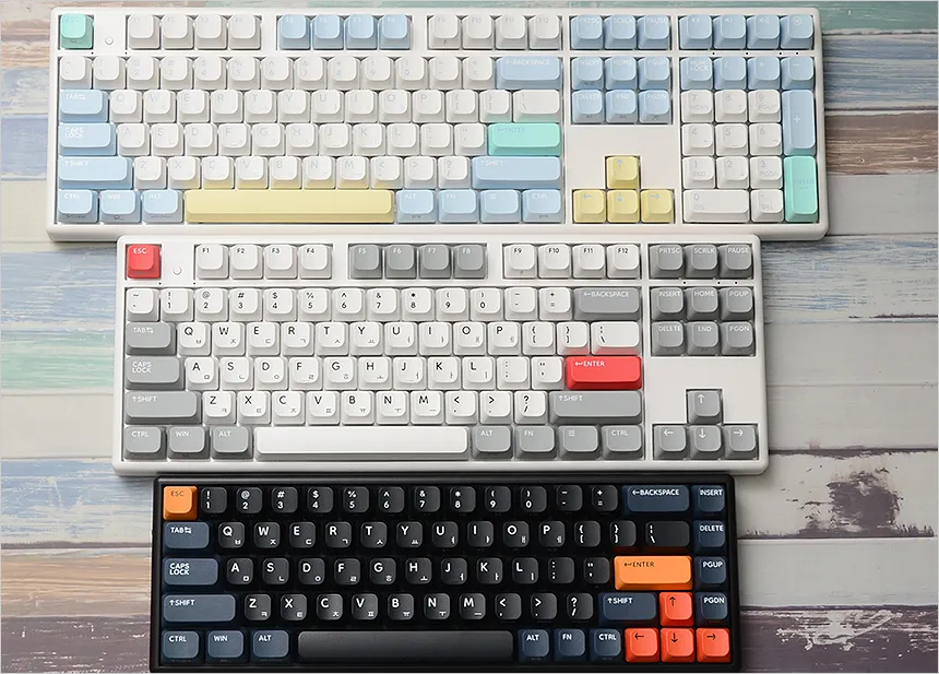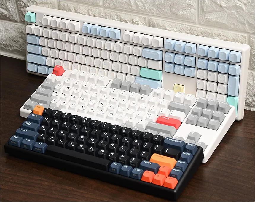 테스트를 위해 책상에 올려놓은 모습으로 모델에 따라 차지하는 공간이 다른 것을 확인할 수 있다. 숫자 입력이 많고 공간에 구애를 받지 않는다면 텐키가 부착된 GK898B PRO 동그리 8K를 추천하며 게임전용으로 사용하거나 책상 공간이 협소하다면 텐키리스 디자인의 GK893B PRO 동그리 8K을 추천한다. (GK868B PRO 동그리 8K는 데스크탑PC 보다는 노트북이나 모바일 디바이스에서 잘 어울리는 모델이다.)