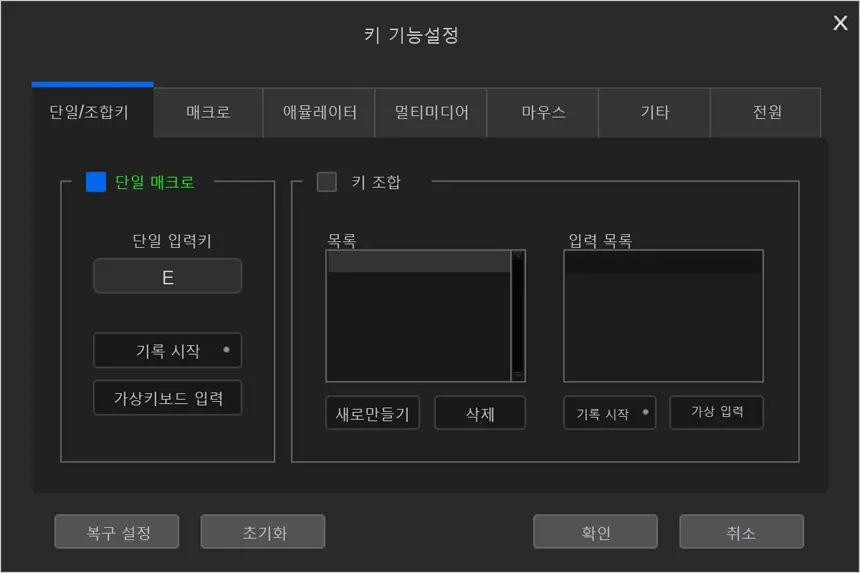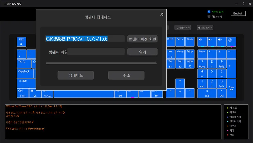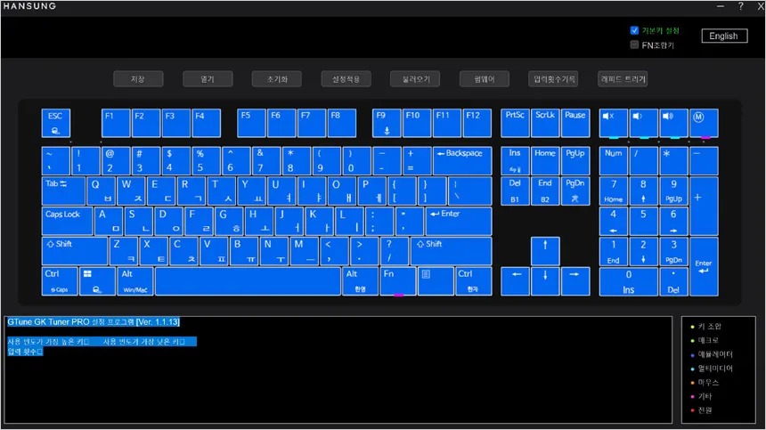 도입부에서 언급한 것과 같이 전용 S/W를 제공해 사용자에 맞게 노트북을 셋팅할 수 있다. (한성 홈페이지 자료실에서 S/W와 펌웨어 등을 다운로드 받을 수 있다.) 상단의 사진은 프로그램을 실행한 모습으로 셋팅값을 저장하고 추후 쉽게 불러올 수 있으며 매크로와 조합키, 멀티미디어 키 등을 설정할 수 있어 편하게 PC를 사용할 수 있다.