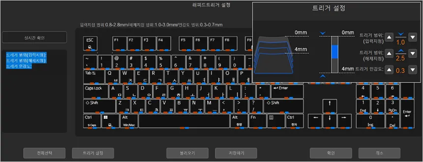 펌웨어 업데이트가 가능하며 도입부에서 강조한 것과 같이 래피드 트리거 설정을 지원한다. 전체 선택을 통해 모든키의 설정값을 동일하게 적용할 수 있을 뿐만 아니라 각각의 키를 독립적으로 설정하는 것도 가능하다.