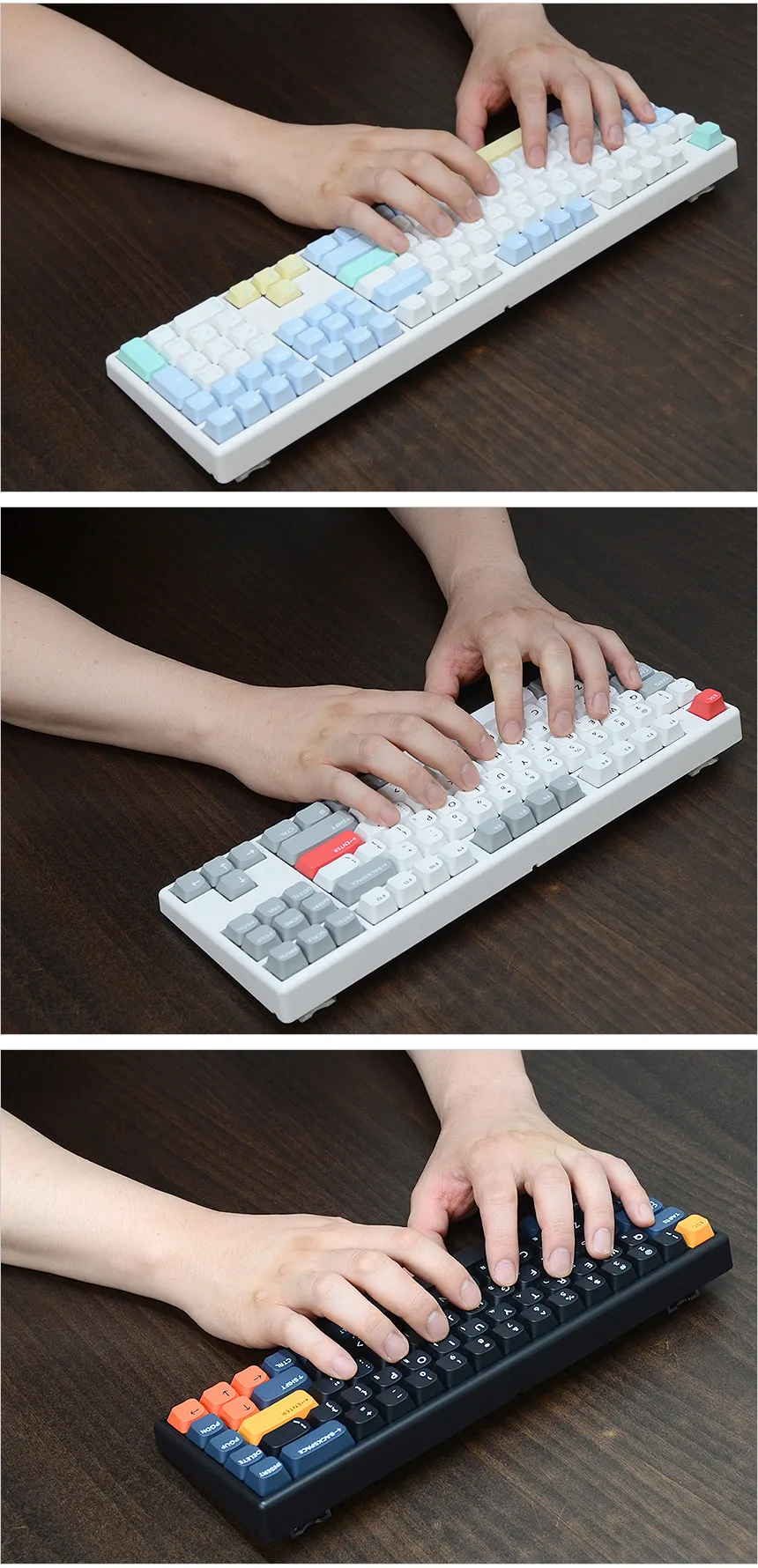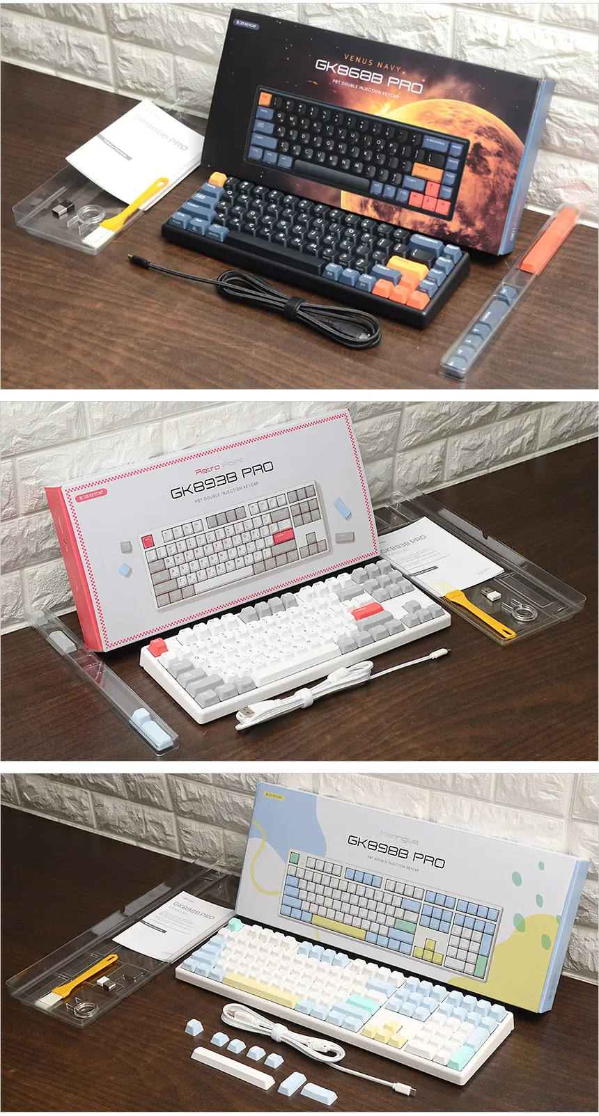 MERINGUE (화이트/민트/블루/옐로우), RETRO POINT (화이트/그레이/레드/블루), VENUS NAVY (블랙/네이비/옐로우/레드) 등 3가지 스타일로 출시되어 사용자의 취향에 따라 제품을 선택할 수 있으며 단일 키압으로 출시되는 대부분의 키보드와 달리 35g 와 45g 중 원하는 모델을 구입할 수 있다. @ 참고로 GK868B 는 MERINGUE, VENUS NAVY 컬러에 35g 키압 모델만 판매된다. 3개 제품은 무게, 크기, 활용도가 다르기 때문에 사용자의 라이프 스타일을 고려해 선택하기 바란다.