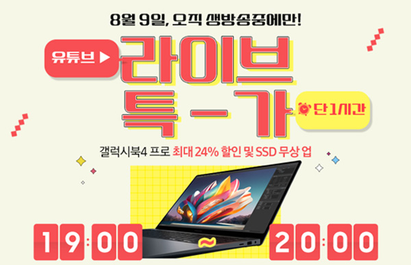 유니씨앤씨는 최신 인텔 코어 울트라 프로세서와 WQXGA+ Dynamic AMOLED 2X 터치스크린을 탑재한 삼성 갤럭시북4 프로 / 프로360 / 울트라 대상으로 최대 61만원 할인과 SSD 무상업, 한컴 오피스팩, 미니 USB 허브, 갤럭시북 제휴 혜택 등 푸짐한 사은품이 증정되는 ‘갤럭시북4 프로’ 라이브 방송을 2024년 8월 9일 19시부터 1시간 동안 유튜브 ‘삼성온라인스토어’를 통하여 진행한다.