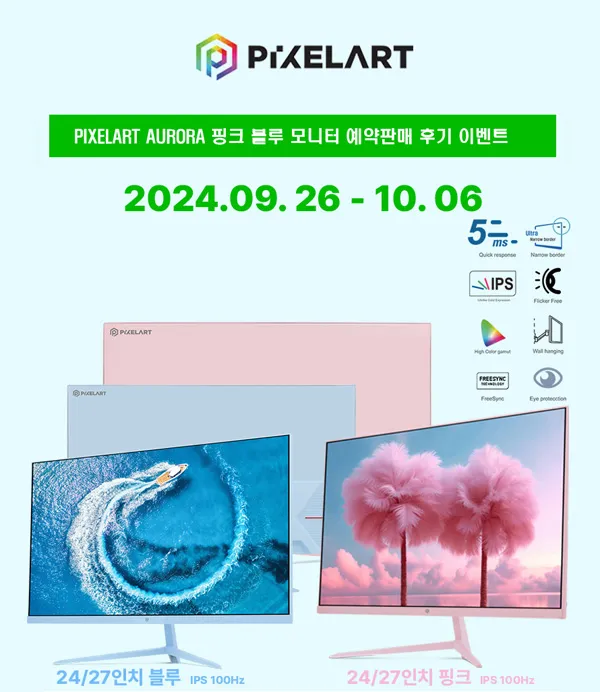 픽셀아트가 오로라(Aurora) 핑크·블루 컬러 모니터 출시를 했으며, 이를 기념으로 예약 판매 이벤트를 진행한다고 전했다.