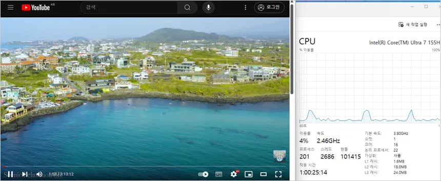 유튜브 고화질 동영상을 이용해 CPU 점유율을 테스트 하고 있는 모습으로 (2160P@60FPS) 3-11% 대의 점유율을 보여주었으며 인터넷을 실행했을 때 30% 중반까지 점유율이 올라가는 것을 확인할 수 있었다.