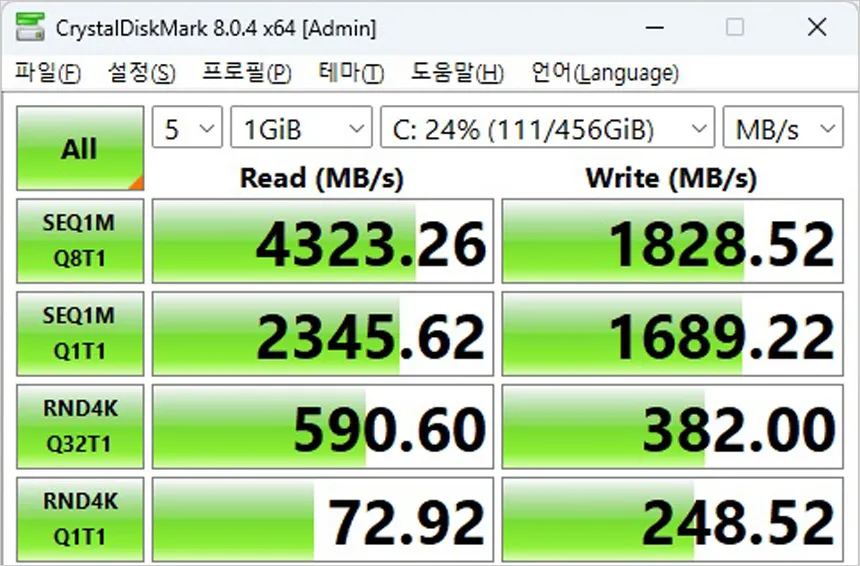 저장장치의 속도를 확인하고 있는 모습으로 PCIe 4.0 NVMe M.2 SSD 가 기본 장착되어 대용량 파일의 빠른 전송이 가능하다. (512GB 용량을 지원해 대용량 최신 게임을 편하게 설치할 수 있다.)