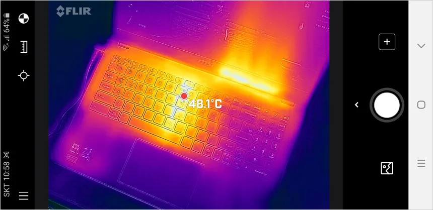 열화상 카메라를 이용해 게임 실행중 노트북의 열분포를 확인하고 있는 모습으로 칩셋이 설치된 중앙을 중심으로 열이 퍼져나가는 것을 확인할 수 있으며 통풍구를 통해 열이 빠져나가는 것도 확인할 수 있었다. 팜래스트는 상대적으로 온도가 낮아 편하게 손을 올려두고 노트북을 사용할 수 있다.