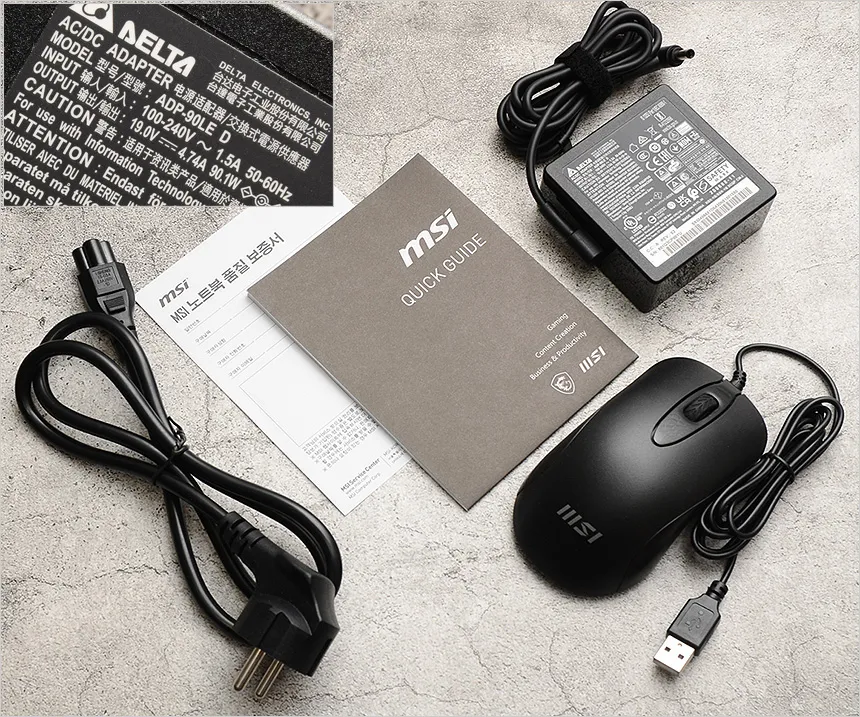 액세서리의 모습으로 65W 어댑터를 지원하는 경쟁 모델과 달리 90W 전원 어댑터가 제공되며 전원 케이블과 게이밍 마우스, 퀵 매뉴얼, 보증서가 포함된 것을 확인할 수 있다.