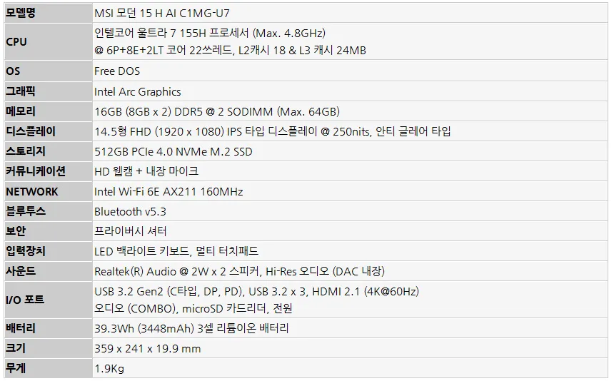 이번에 리뷰를 진행 할 MSI 모던 15 H AI C1MG-U7 는 고가의 게이밍이나 크리에이터 노트북에서 사용하는 인텔코어 울트라 7 155H 프로세서를 탑재해 강력한 성능을 경험할 수 있는 가성비 노트북으로 16GB 의 넉넉한 메모리와 512GB PCIe 4.0 NVMe SSD를 탑재해 다양한 용도로 활용할 수 있다.