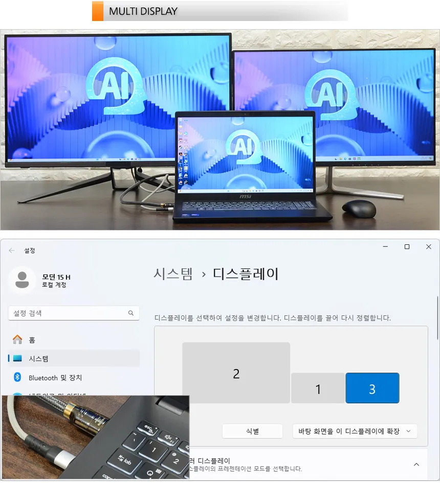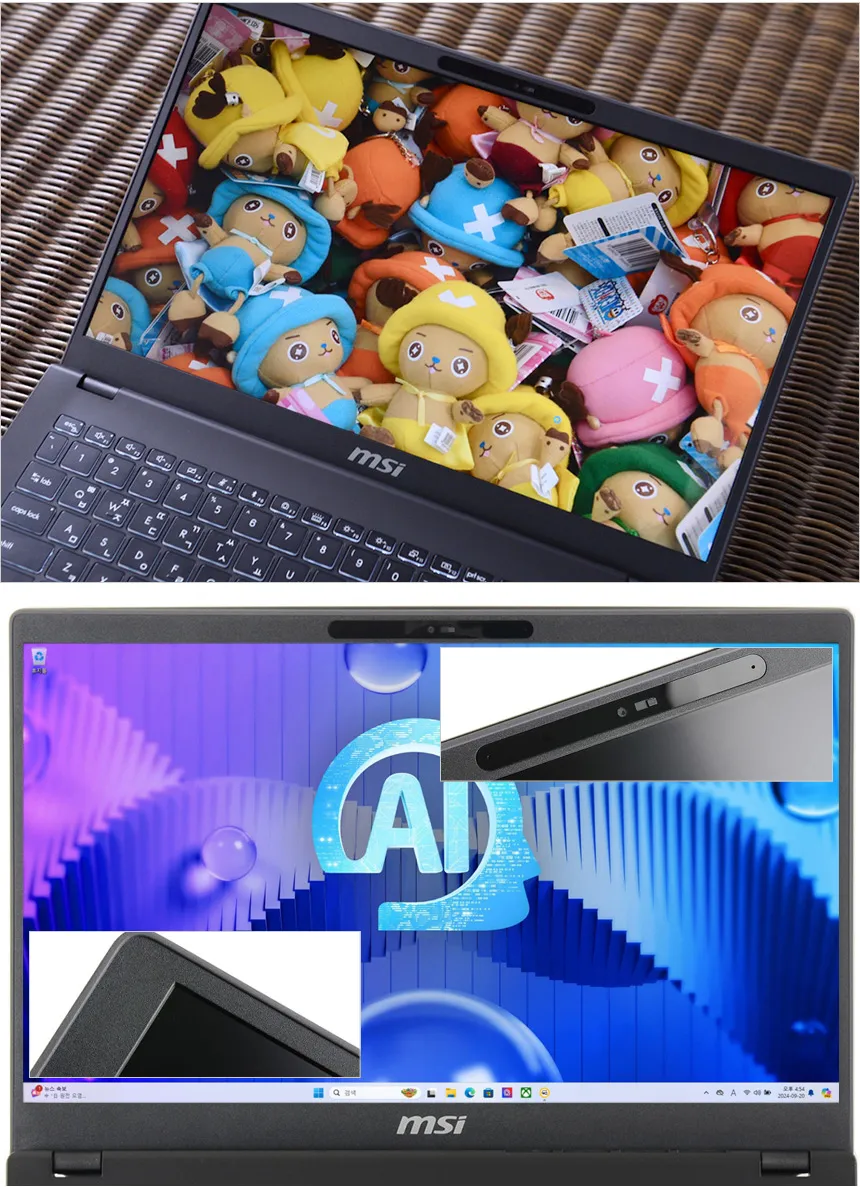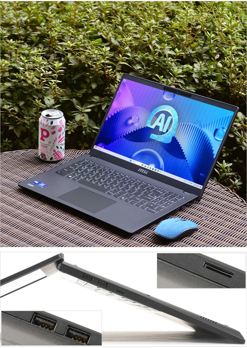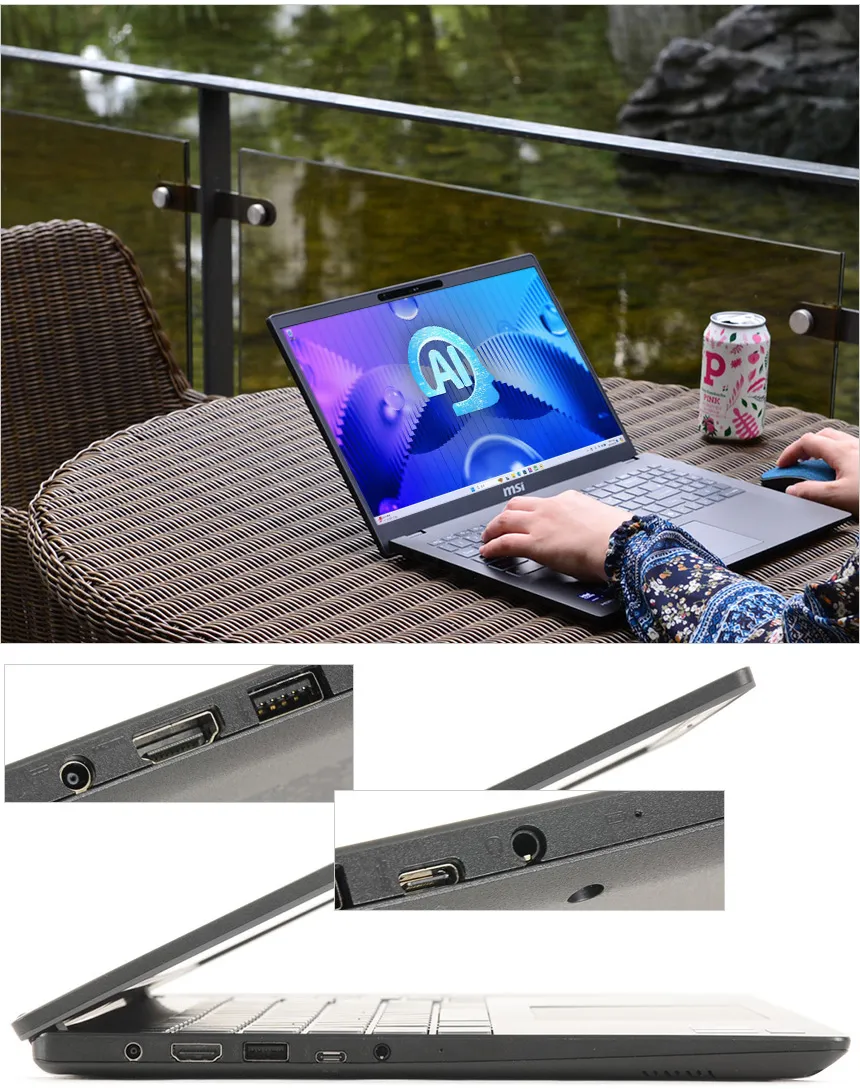 MSI 모던 15 H AI C1MG-U7 는 AI 전용 프로세서 유닛을 탑자한 휴대용 AI 노트북으로 PCR 소재를 사용한 모던한 디자인과 부담없는 무게로 편하게 들고 다니며 다용도로 활용할 수 있다. 상단에서 언급한 것과 같이 PD충전을 지원해 편하게 전원을 공급할 수 있으며 15.6형 대화면으로 게임이나 작업시 시원시원한 영상을 즐길 수 있다.