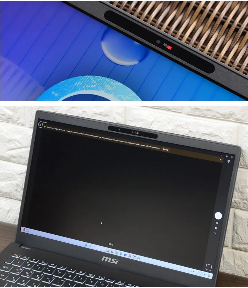카메라에는 프라이버시 셔터가 장착되어 사생활 노출이나 비주얼 해킹을 미연에 방지할 수 있다. 사진과 같이 셔터를 밀어주면 카메라를 가리게 되고 드라이버도 비활성화 되어 절대 카메라를 사용할 수 없다.