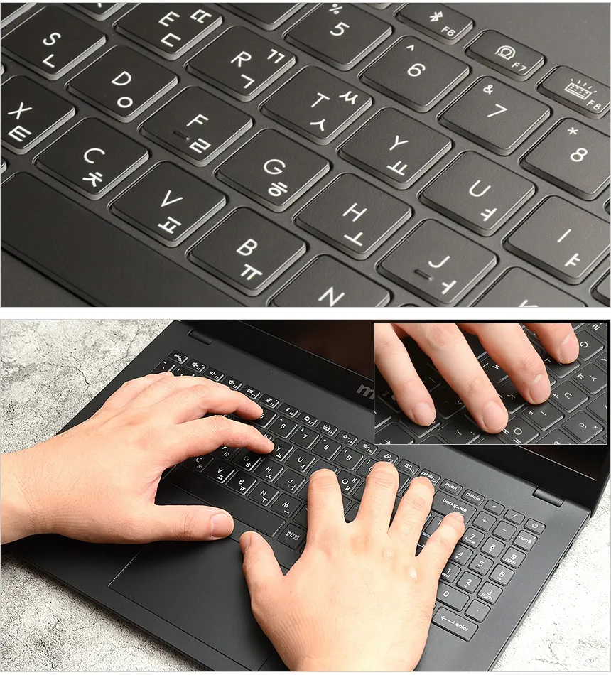 키간격이 넓은 치클릿 방식으로 오타없는 고속 타이핑이 가능하며 톡톡 튀는 키감으로 확연한 피드백을 경험할 수 있다. (일반 노트북 대비 키압은 약간 높은편이다.) 또한 팜래스트가 손을 완전히 받쳐주어 편하게 타이핑 할 수 있었다.