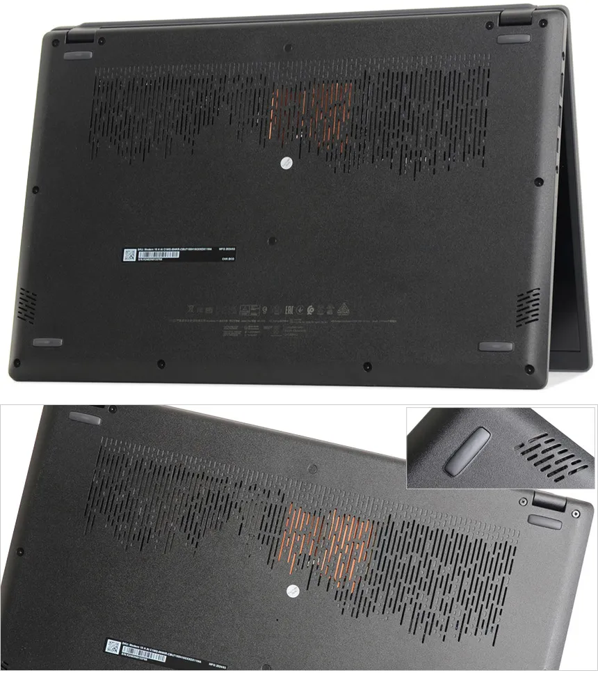 노트북 바닥면의 모습으로 상단과 하단에 고무패드가 부착되어 미끄러짐을 방지하며 충격 등으로부터 노트북을 보호한다. 또한 주요 부품이 장착된 상단에는 통풍구를 설치해 안정성을 높였으며 양 측면에 스피커를 지원해 시원한 사운드를 즐길 수 있다.