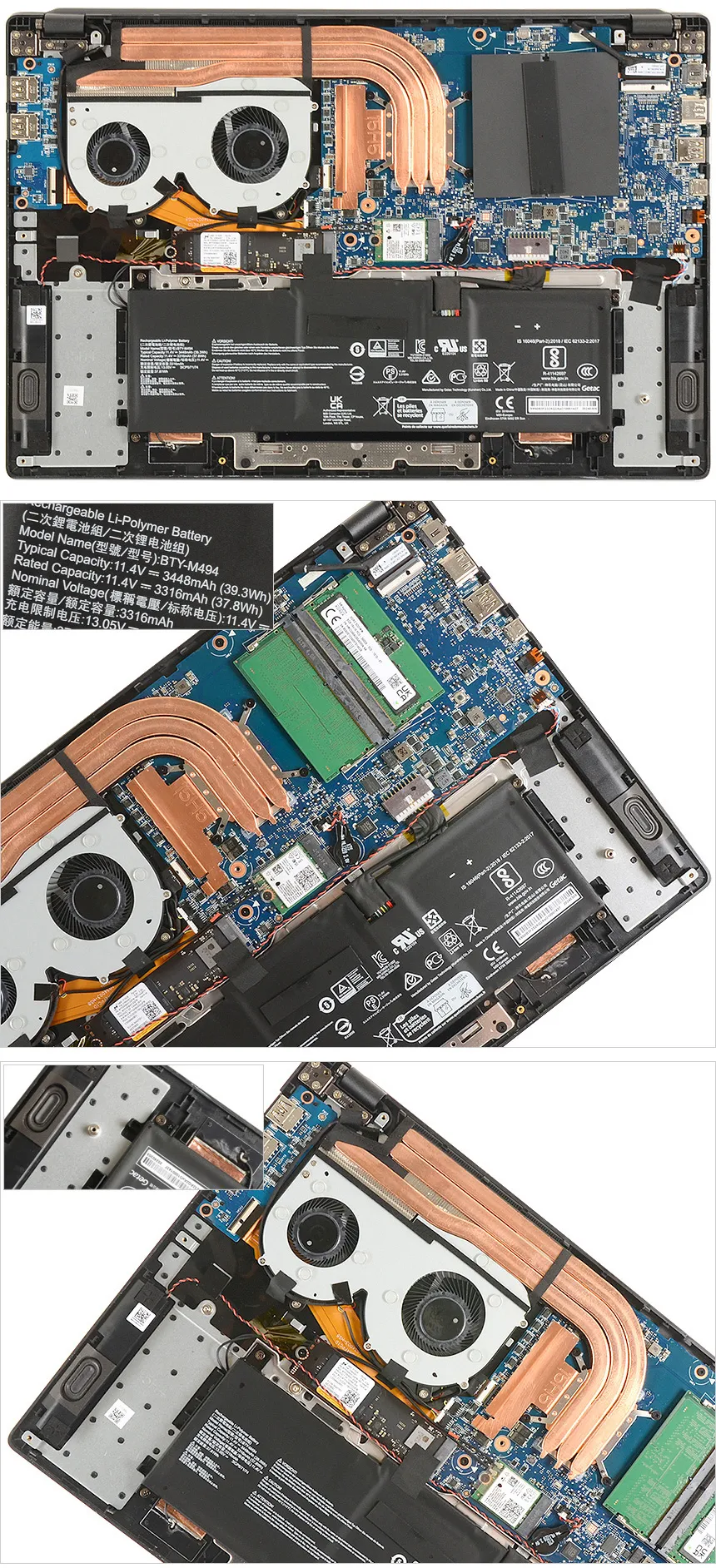 바닥면 내부의 모습으로 원팬을 사용하는 경쟁 모델들과 달리 듀얼팬이 적용된 것이 눈에 띄며 히트파이프가 CPU와 연결되어 빠르게 열을 식혀준다. 하단에는 3448mAh 용량의 리튬이온 배터리가 설치되어 있고 스피커와 무선랜 안테나도 장착된 것을 확인할 수 있다.