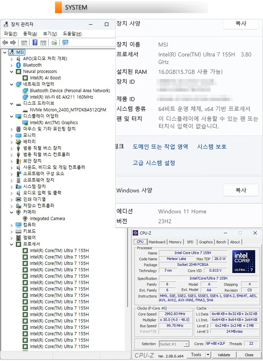 시스템 정보를 확인하고 있는 모습으로 6개의 성능코어와 8개의 효율코어에 2개의 초저전력 코어가 추가된 인텔코어 울트라 7 155H 프로세서가 장착된 것을 확인할 수 있다. 7nm 공정으로 개발된 것을 확인할 수 있으며 AI 부스트를 지원해 뛰어난 AI 성능을 구현한다.
