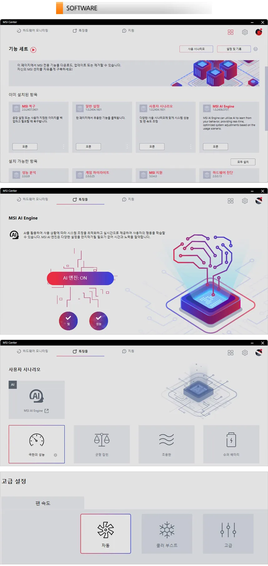 MSI 센터는 모듈형 방식으로 사용자가 원하는 S/W를 설치할 수 있다. 상단의 사진은 기본 설치된 프로그램을 실행한 모습으로 퍼포먼스 설정을 지원하고 (극한의 성능 모드에서 팬속도 조절이 가능하다.) 시스템을 손쉽게 최적화 할 수 있도록 AI 엔진을 지원한다. (노트북의 상태와 용도에 따라 최적의 컨디션을 유지할 수 있도록 자동 조절해 준다.)