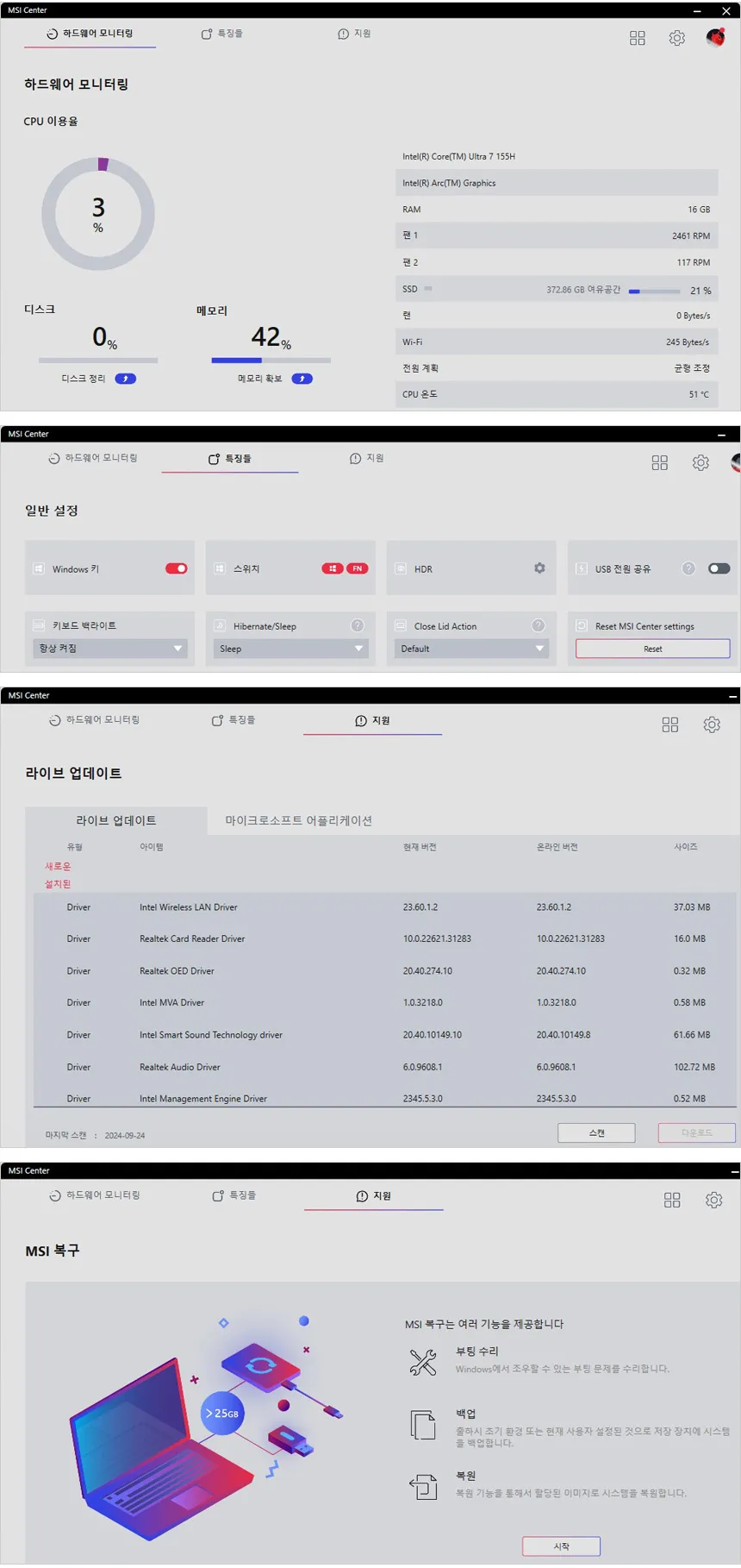 시스템 모니터링이 가능하며 윈도우키와 키보드 백라이트, 상시전원 등을 설정할 수 있다. 또한 시스템 업데이트 지원으로 최신의 컨디션을 유지할 수 있으며 복구 기능도 지원해 안정성을 높였다.