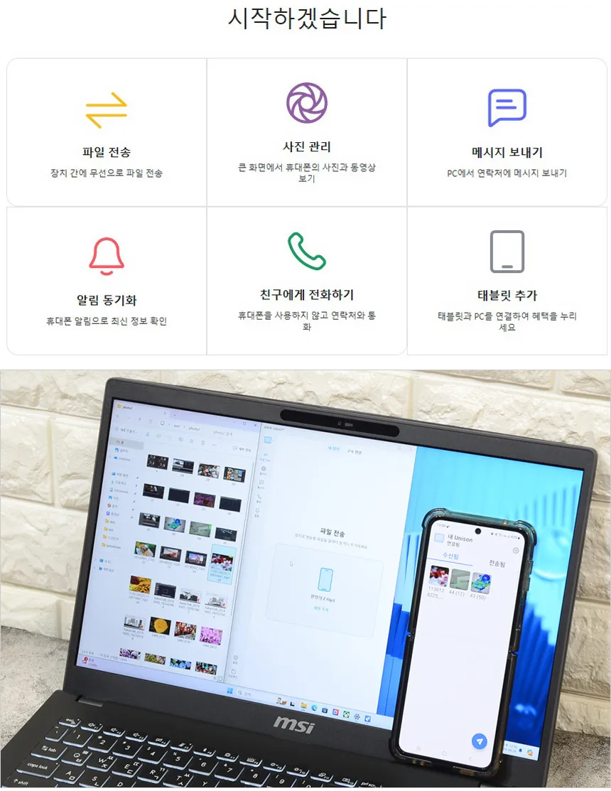 인텔 유니슨을 사용하면 노트북에서 전화를 걸거나 문자 등을 전송할 수 있다. 또한 파일전송 기능을 제공해 사진과 같이 손쉽게 상호간 파일전송이 가능하다. (동영상을 확인하기 바란다.)