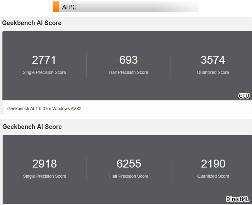 AI 전용 벤치마크 툴을 이용해 AI 성능 테스트를 진행하고 있는 모습으로 대부분의 S/W를 부드럽게 실행할 수 있는 높은 스코어를 보여주었다.