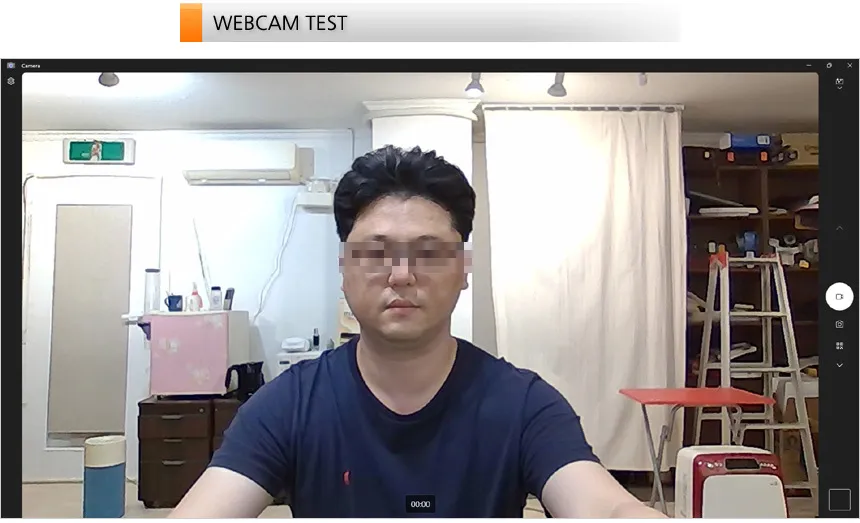 HD 웹캠의 화질을 확인하고 있는 모습으로 어두운 실내에서도 선명한 영상을 보여주었다. (FHD 대비 약간의 수채화 현상이 보여지기는 하지만 선명도는 상당히 뛰어났다.) 화상회의나 셀프촬영, 게임방송 등의 용도로 유용하게 활용할 수 있을 것이다.
