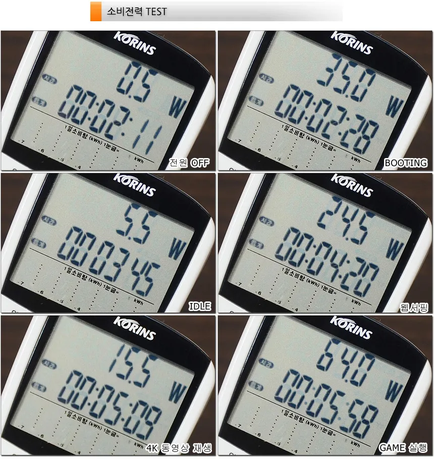 소비전력 테스트를 진행하고 있는 모습으로 (최고성능 모드) 캐주얼한 작업에서는 저전력으로 작동하지만 게임이나 작업시 소비전력이 상당히 높은 것을 확인할 수 있다. (65W 전원 어댑터를 사용하는 경쟁 모델들은 50W 대로 동작하는데 반해 이 제품은 60W 이상으로 전력이 올라갔다.)