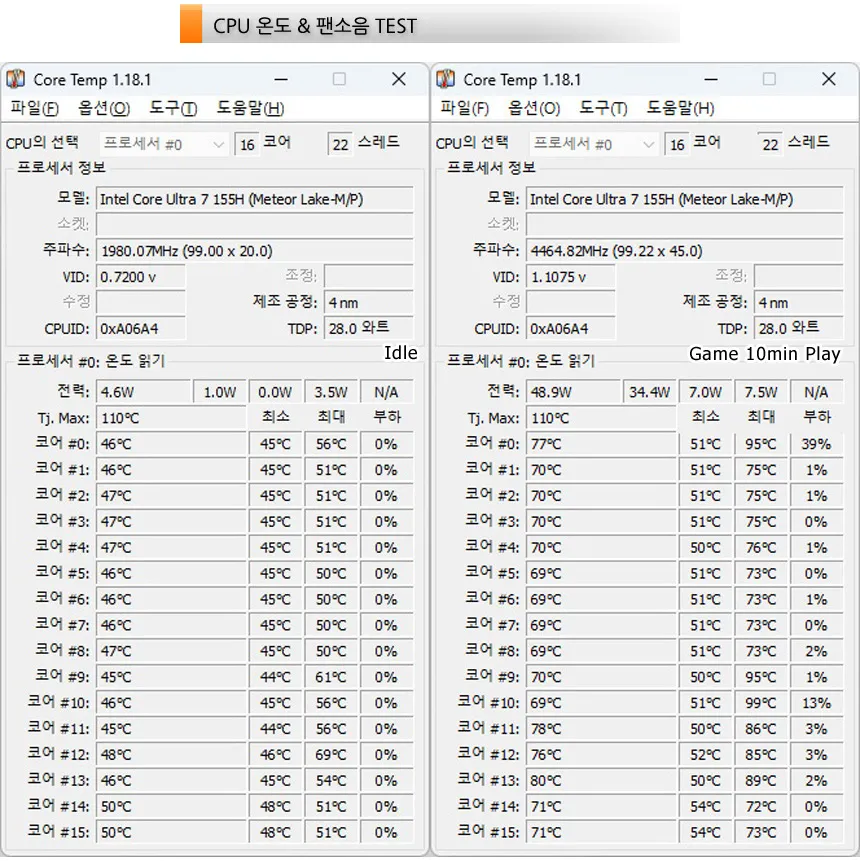 CPU 온도를 측정한 모습으로 (실내온도 26도) 아무것도 하지 않은 IDLE 상태에서는 40도 중반으로 작동했으며 10분 동안 게임을 실행한 후 온도를 측정했을 때에는 70도 후반까지 온도가 올라가는 것을 확인할 수 있었다. (가끔식 90도 이상으로 올라갔지만 대부분 70도 부근에서 게임이 실행되는 것을 확인할 수 있었다.)