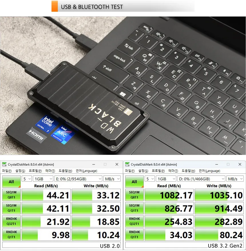 USB 3.2 Gen2를 지원해 빠른 데이터 전송이 가능하다. 상단의 사진은 USB 3.2 외장 SSD를 이용해 테스트를 진행하고 있는 모습으로 USB 2.0과 비교되는 빠른 속도를 보여 주었다.
