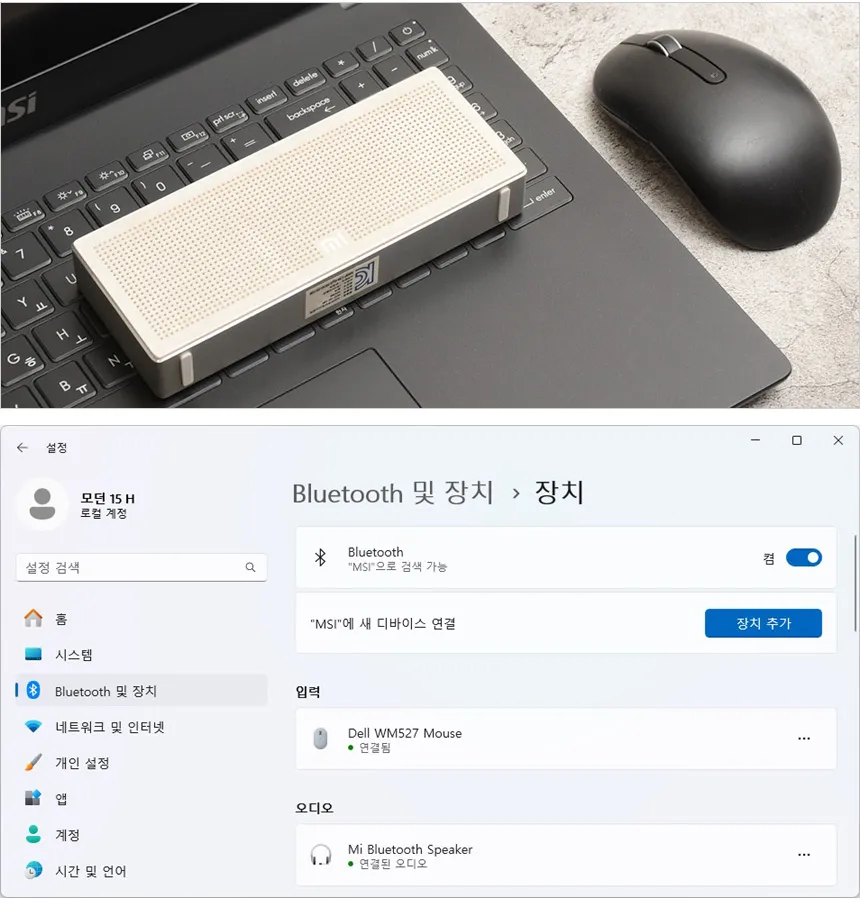블루투스를 지원해 다양한 액세서리를 무선으로 연결할 수 있다. 상단의 사진은 스피커와 마우스의 연결 모습으로 원활하게 페어링 되는 것을 확인할 수 있었으며 완벽하게 작동했다.